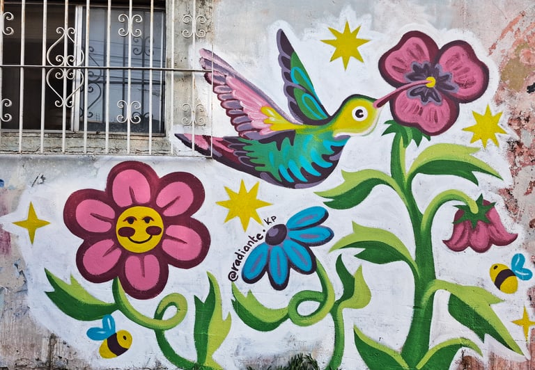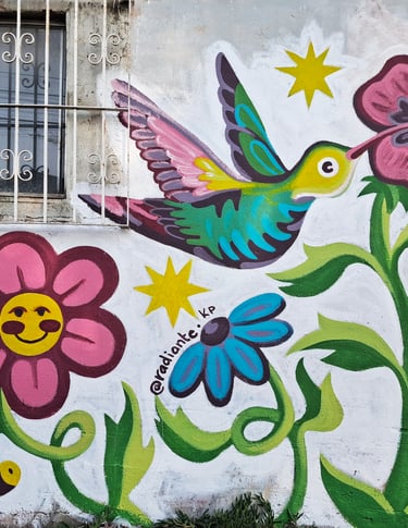 Mural colectivo en Heta Galería, inspirado en el simbolismo del colibrí y en el origen náhuatl del nombre de la calle donde se ubica la galería: lugar donde abundan los colibríes. La obra resalta al colibrí en su acto polinizador, símbolo de armonía y equilibrio en su hábitat natural, en estrecha conexión con las plantas que lo rodean.