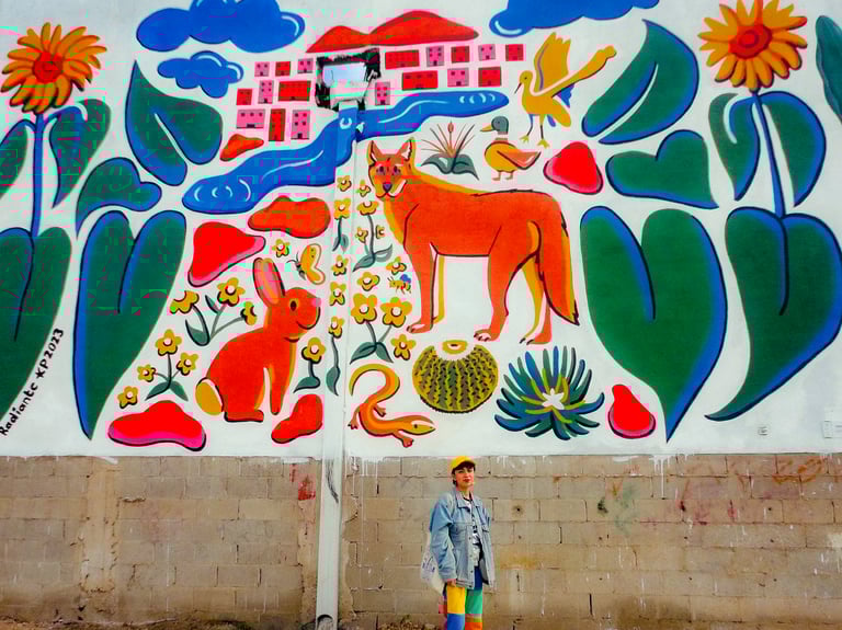 Desde 2022, he participado en diversos proyectos de muralismo, colaborando con artistas de todo México y con fundaciones comprometidas con el arte y la transformación social. A través de estas iniciativas, he contribuido a la resignificación de espacios, llevando color, creatividad e impacto positivo a distintas comunidades.